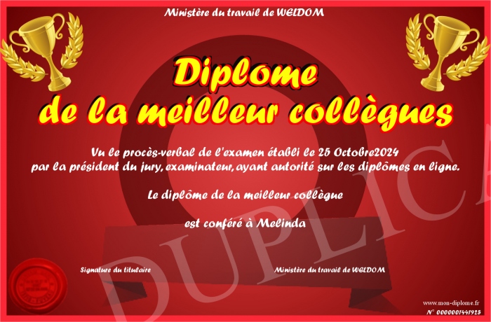 Envoyez par email votre Diplôme de la meilleur collègues personalisé