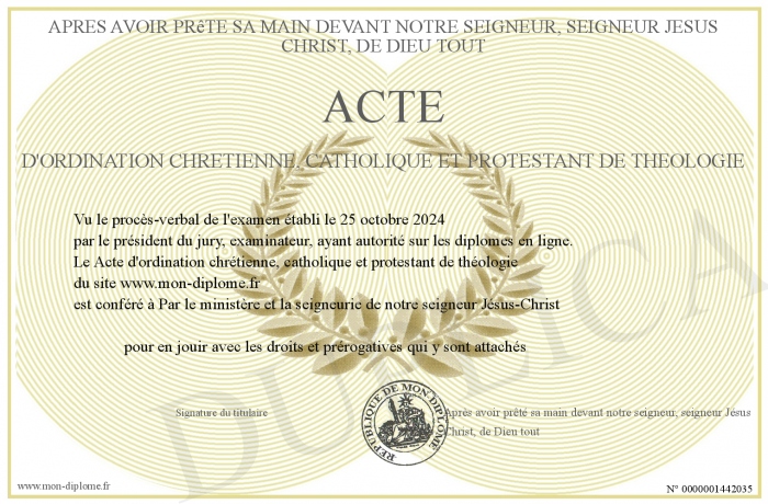 Envoyez par email votre Acte d'ordination chrétienne, catholique et protestant de théologie personalisé