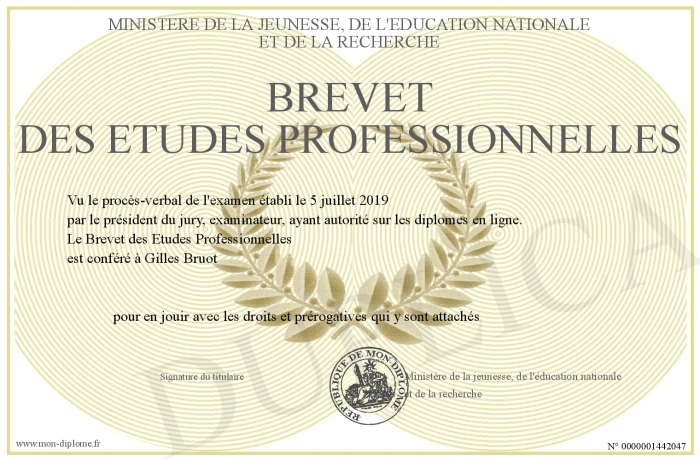 Envoyez par email votre Brevet des Etudes Professionnelles personalisé