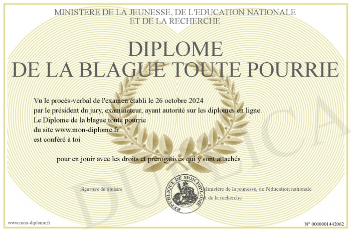 Envoyez par email votre Diplôme de la blague toute pourrie personalisé