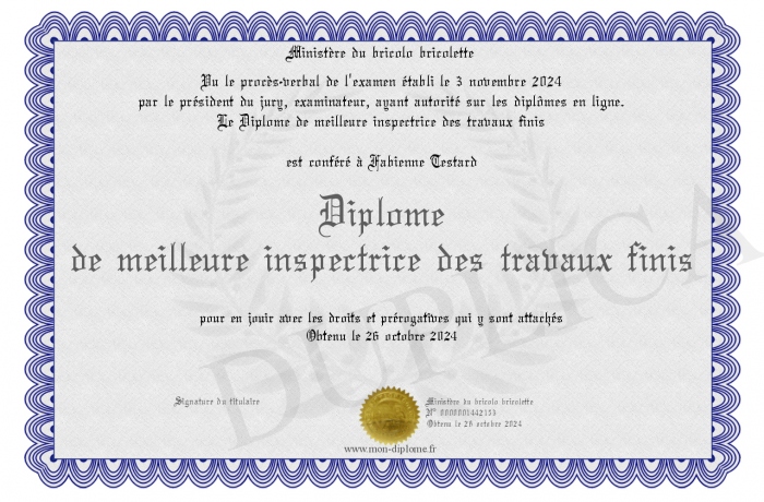 Envoyez par email votre Diplôme de meilleure inspectrice des travaux finis personalisé