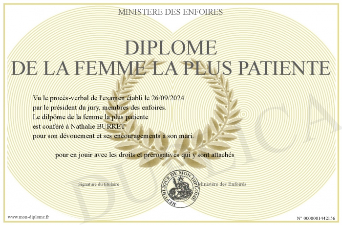 Envoyez par email votre Diplôme de la femme la plus patiente personalisé