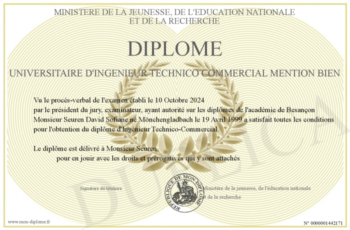 Envoyez par email votre Diplôme universitaire d'ingénieur Technico Commercial mention bien personalisé
