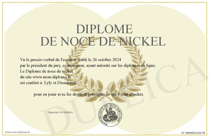 Envoyez par email votre Diplôme de noce de nickel personalisé