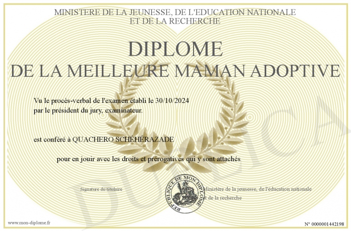 Envoyez par email votre Diplôme de la meilleure Maman adoptive personalisé