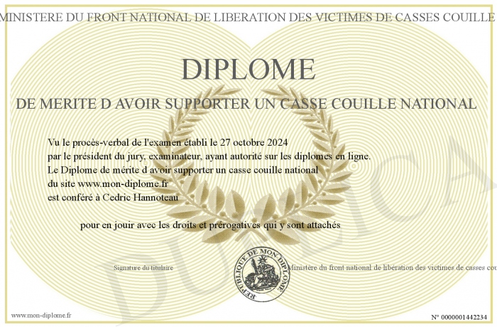 Envoyez par email votre Diplôme de mérite d avoir supporter un casse couille national personalisé