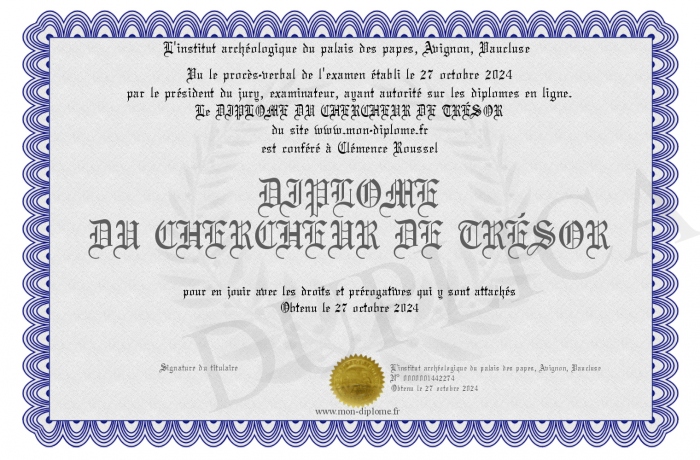 Envoyez par email votre DIPLOME DU CHERCHEUR DE TRÉSOR personalisé