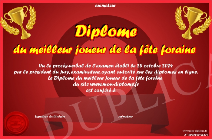 Envoyez par email votre Diplôme du meilleur joueur de la fête foraine personalisé