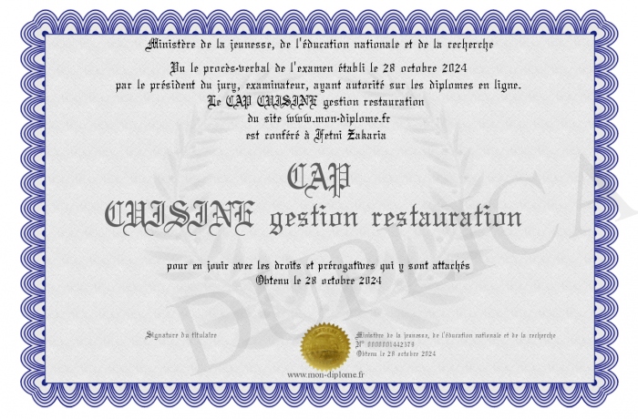 Envoyez par email votre CAP CUISINE gestion restauration personalisé