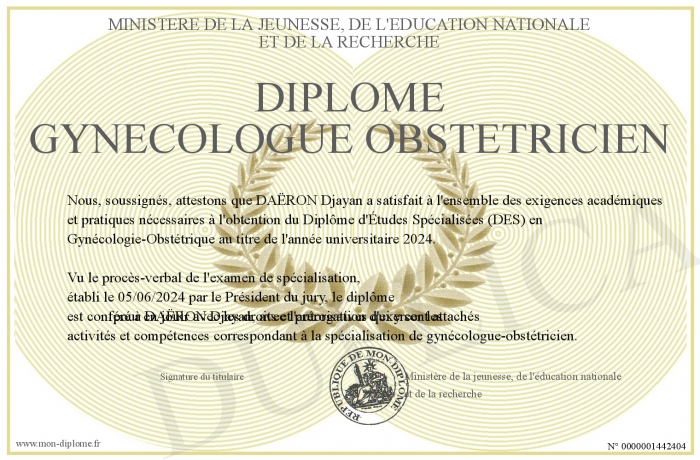Envoyez par email votre Diplôme gynécologue obstetricien personalisé