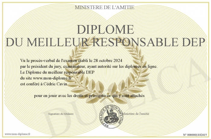 Envoyez par email votre Diplôme du meilleur responsable DEP personalisé
