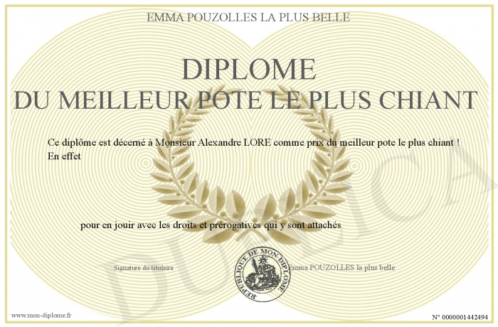 Envoyez par email votre diplôme du meilleur pote le plus chiant personalisé
