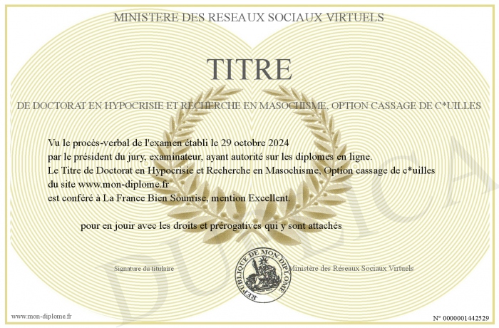 Envoyez par email votre Titre de Doctorat en Hypocrisie et Recherche en Masochisme, Option cassage de c*uilles personalisé