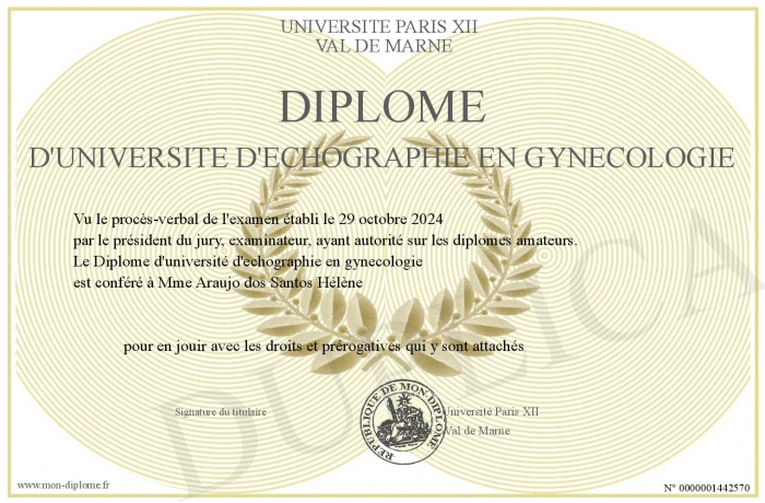 Envoyez par email votre Diplome d'université d'echographie en gynecologie personalisé