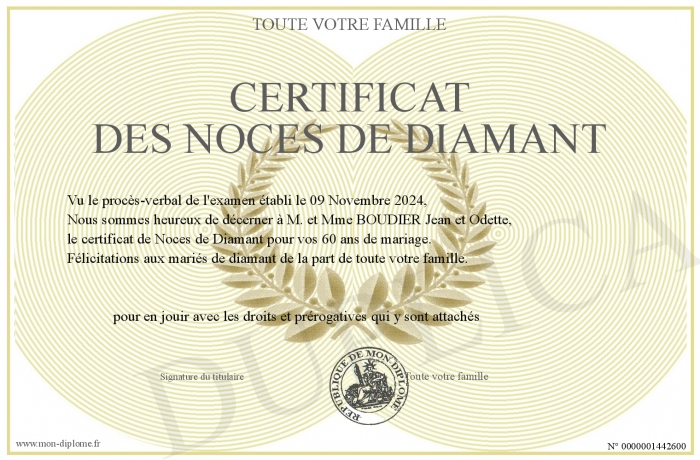 Envoyez par email votre Certificat des Noces de Diamant personalisé
