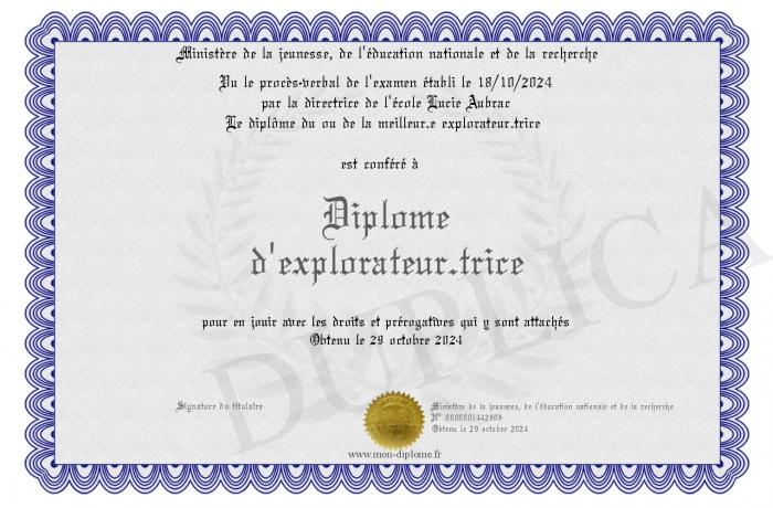 Envoyez par email votre Diplôme d'explorateur.trice personalisé