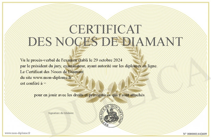 Envoyez par email votre Certificat des Noces de Diamant personalisé
