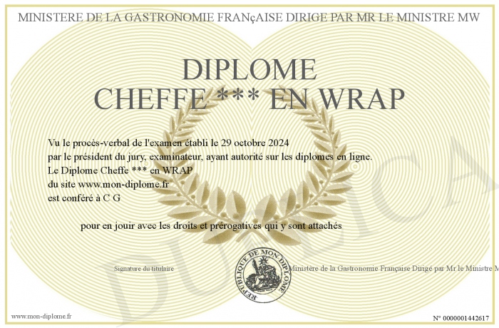 Envoyez par email votre Diplôme Cheffe *** en WRAP personalisé