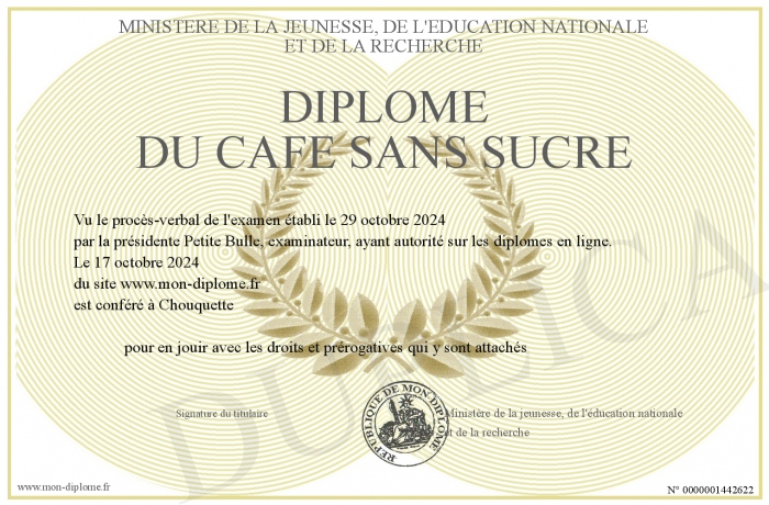 Envoyez par email votre Diplôme du Café sans sucre personalisé