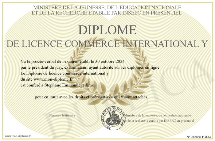 Envoyez par email votre Diplôme de licence commerce international y personalisé