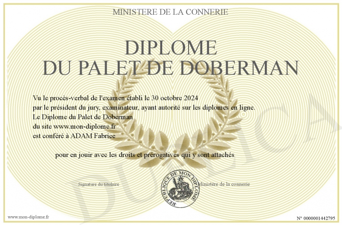 Envoyez par email votre Diplôme du Palet de Doberman personalisé