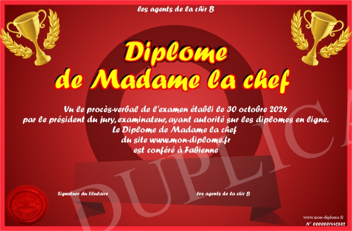 Envoyez par email votre Diplôme de Madame la chef personalisé