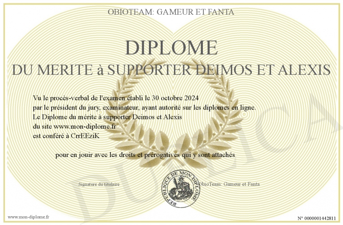 Envoyez par email votre Diplôme du mérite à supporter Deimos et Alexis personalisé
