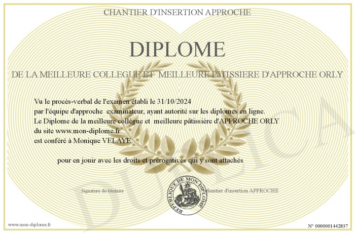Envoyez par email votre Diplôme de la meilleure collègue et meilleure pâtissière d'APPROCHE ORLY personalisé