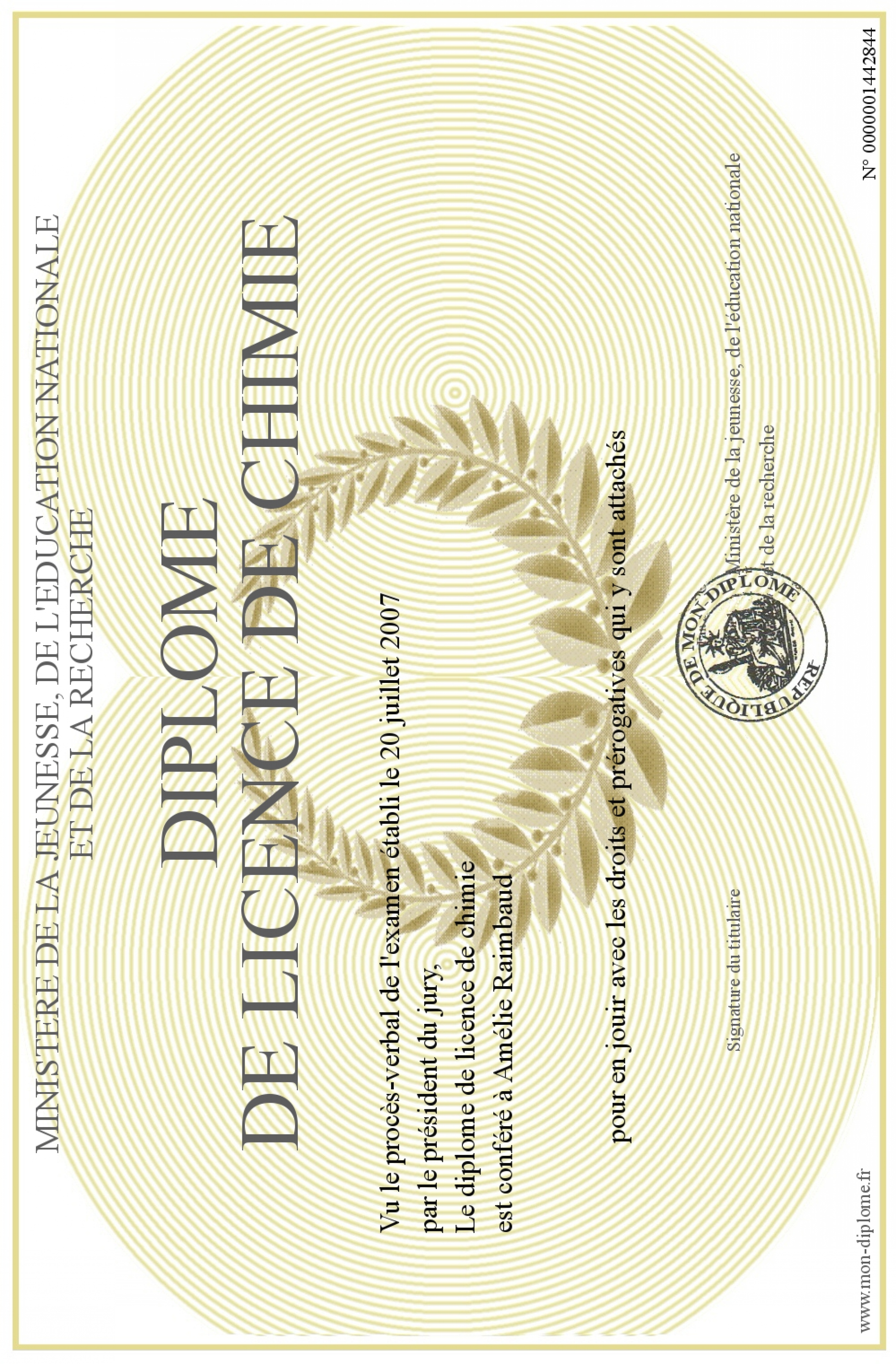 Envoyez par email votre diplôme de licence de chimie personalisé