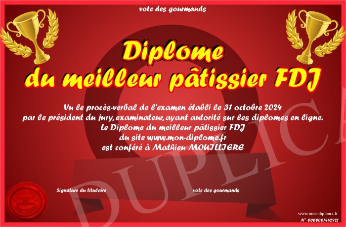 Envoyez par email votre Diplôme du meilleur pâtissier FDJ personalisé