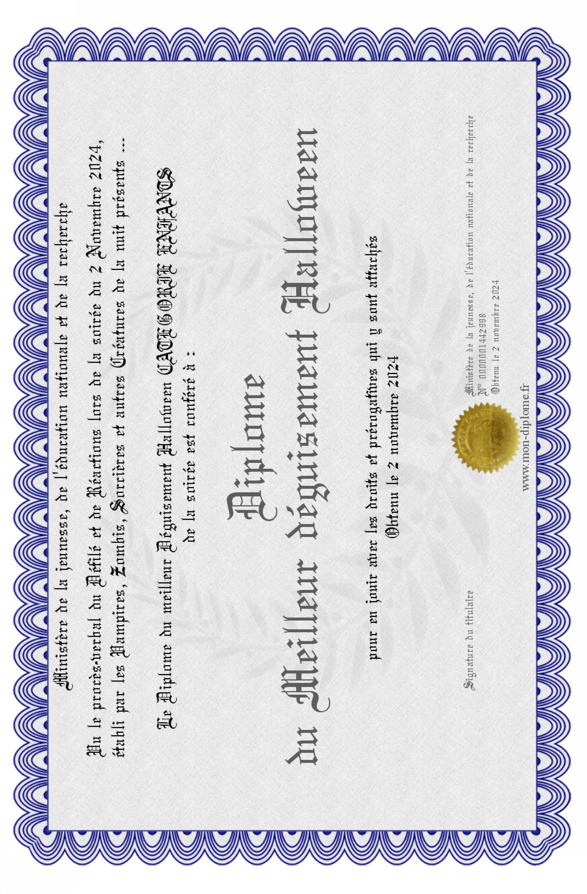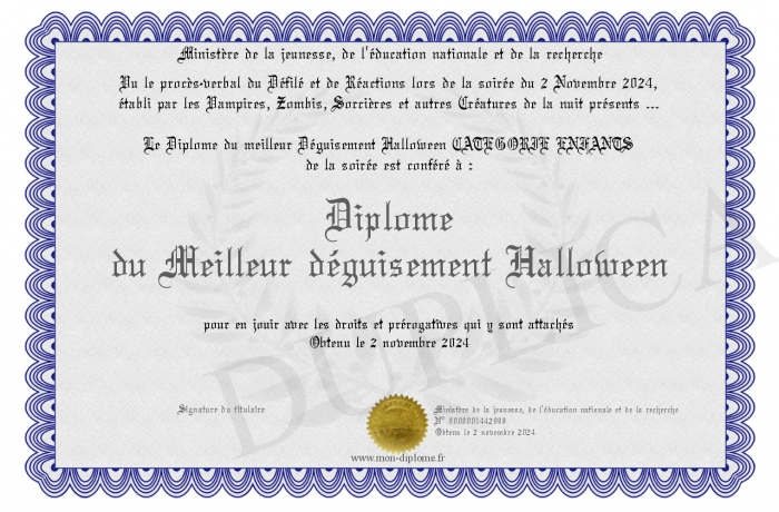 Envoyez par email votre Diplôme du Meilleur déguisement Halloween personalisé