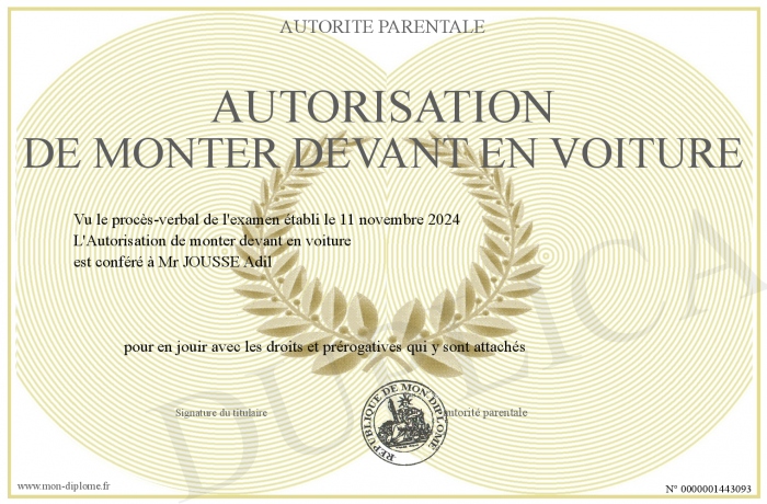 Envoyez par email votre Autorisation de monter devant en voiture personalisé