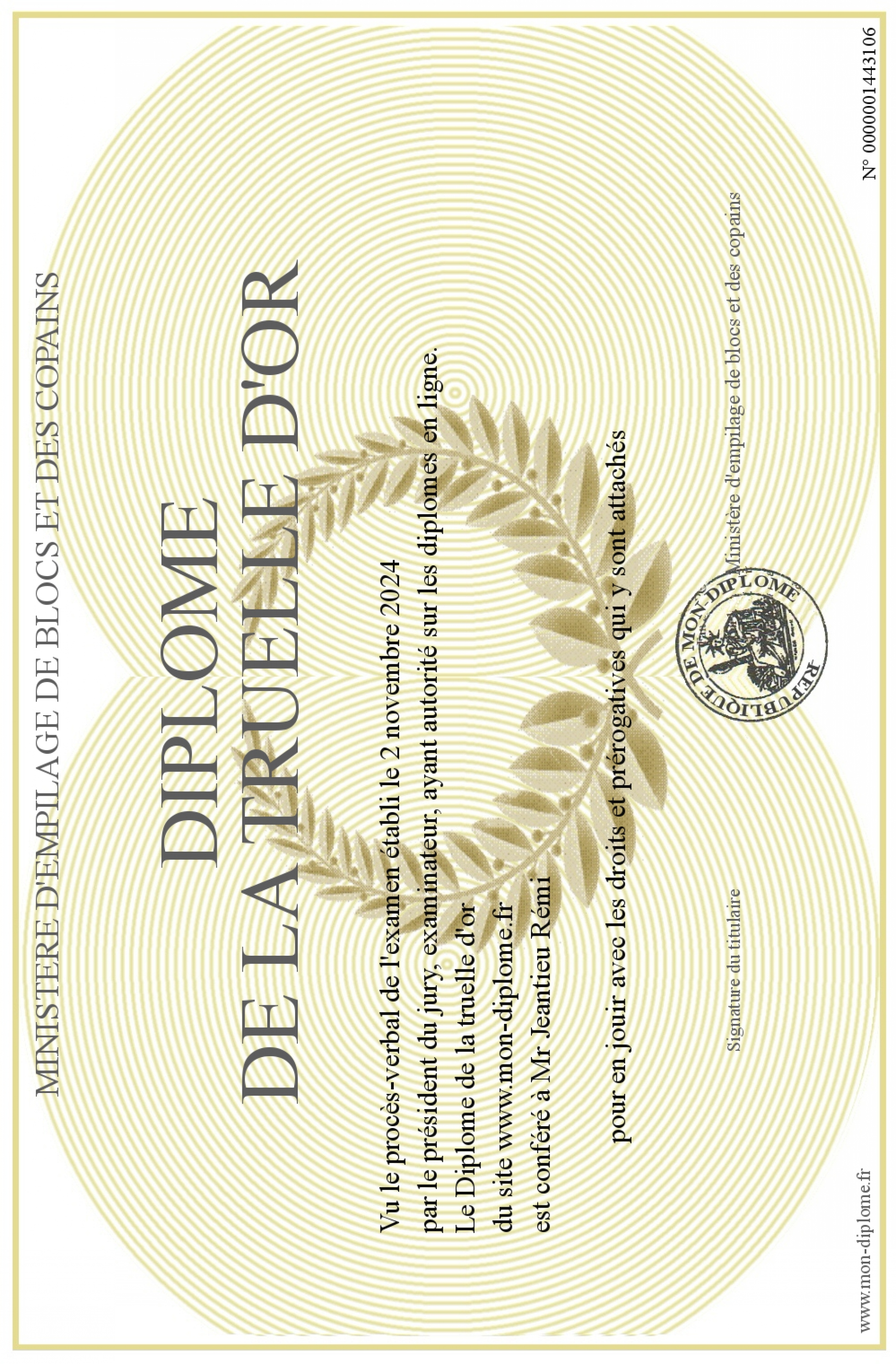 Envoyez par email votre Diplôme de la truelle d'or personalisé