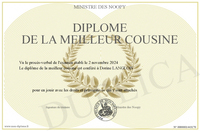 Envoyez par email votre Diplôme de la meilleur cousine personalisé