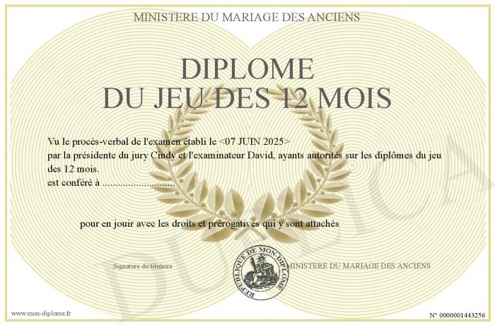Envoyez par email votre DIPLOME DU JEU DES 12 MOIS personalisé