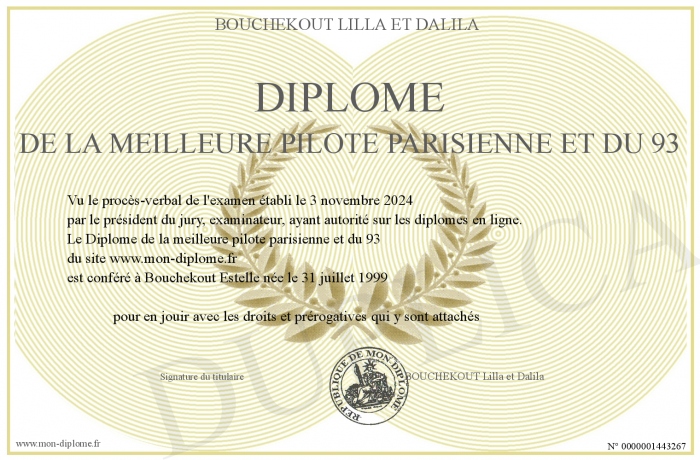 Envoyez par email votre Diplôme de la meilleure pilote parisienne et du 93 personalisé