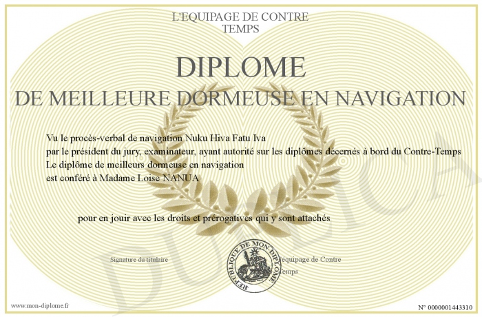 Envoyez par email votre Diplome de Meilleure dormeuse en navigation personalisé