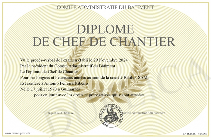 Envoyez par email votre Diplome de Chef de Chantier personalisé