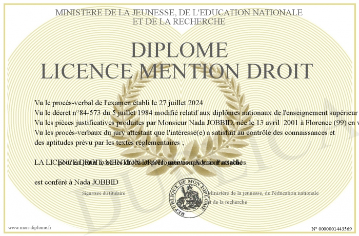 Envoyez par email votre Diplôme Licence mention droit personalisé