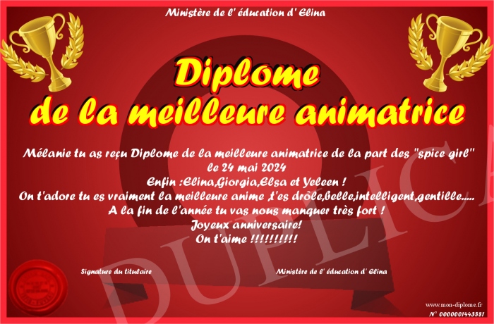 Envoyez par email votre Diplôme de la meilleure animatrice personalisé