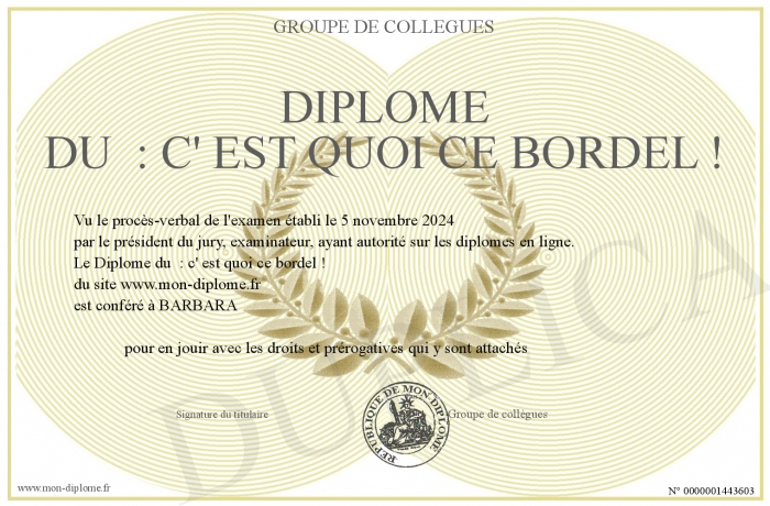 Envoyez par email votre Diplôme du : c' est quoi ce bordel ! personalisé