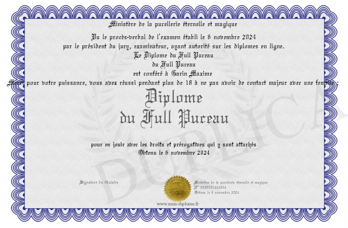 Envoyez par email votre Diplôme du Full Puceau personalisé