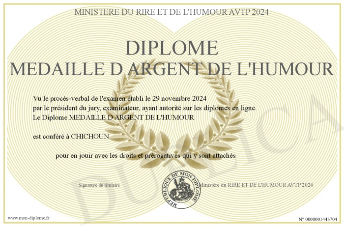 Envoyez par email votre Diplôme MEDAILLE D ARGENT DE L'HUMOUR personalisé
