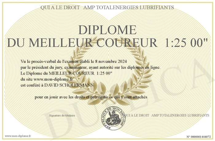 Envoyez par email votre Diplôme du MEILLEUR COUREUR 1:25 00- personalisé
