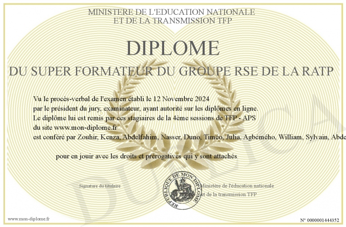 Envoyez par email votre Diplôme du SUPER FORMATEUR DU GROUPE RSE DE LA RATP personalisé