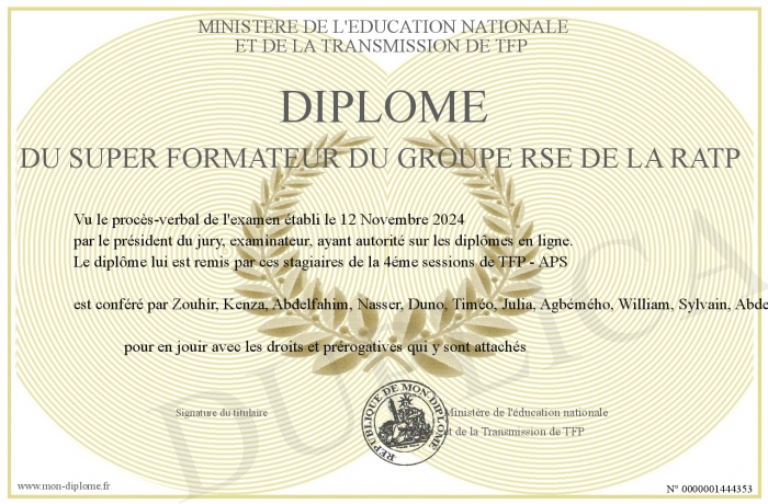 Envoyez par email votre Diplôme DU SUPER FORMATEUR DU GROUPE RSE DE LA RATP personalisé