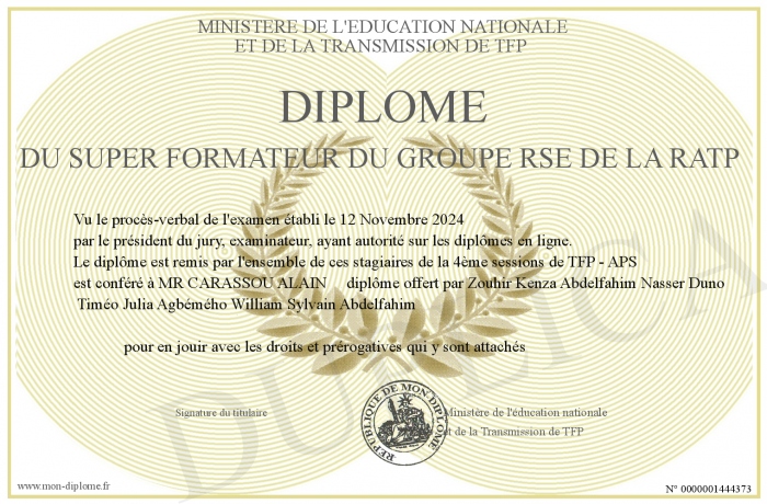 Envoyez par email votre Diplôme du SUPER FORMATEUR DU GROUPE RSE DE LA RATP personalisé