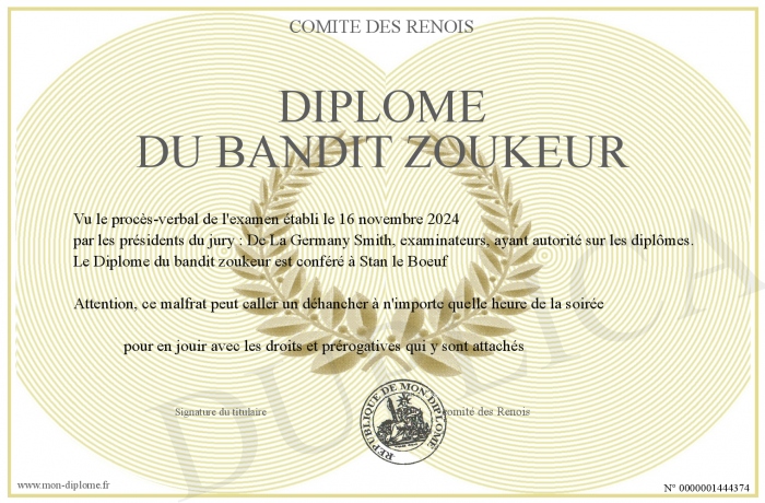 Envoyez par email votre Diplôme du bandit zoukeur personalisé