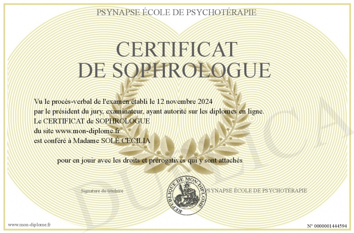 Envoyez par email votre CERTIFICAT de SOPHROLOGUE personalisé