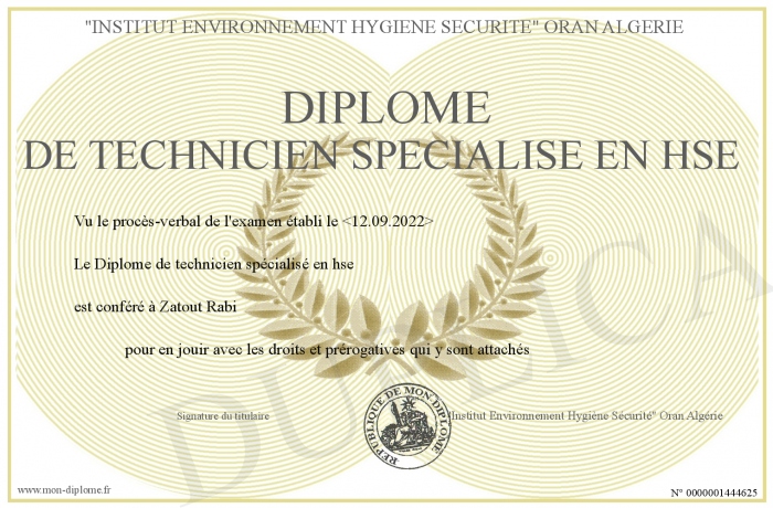 Envoyez par email votre Diplome de technicien spécialisé en hse personalisé